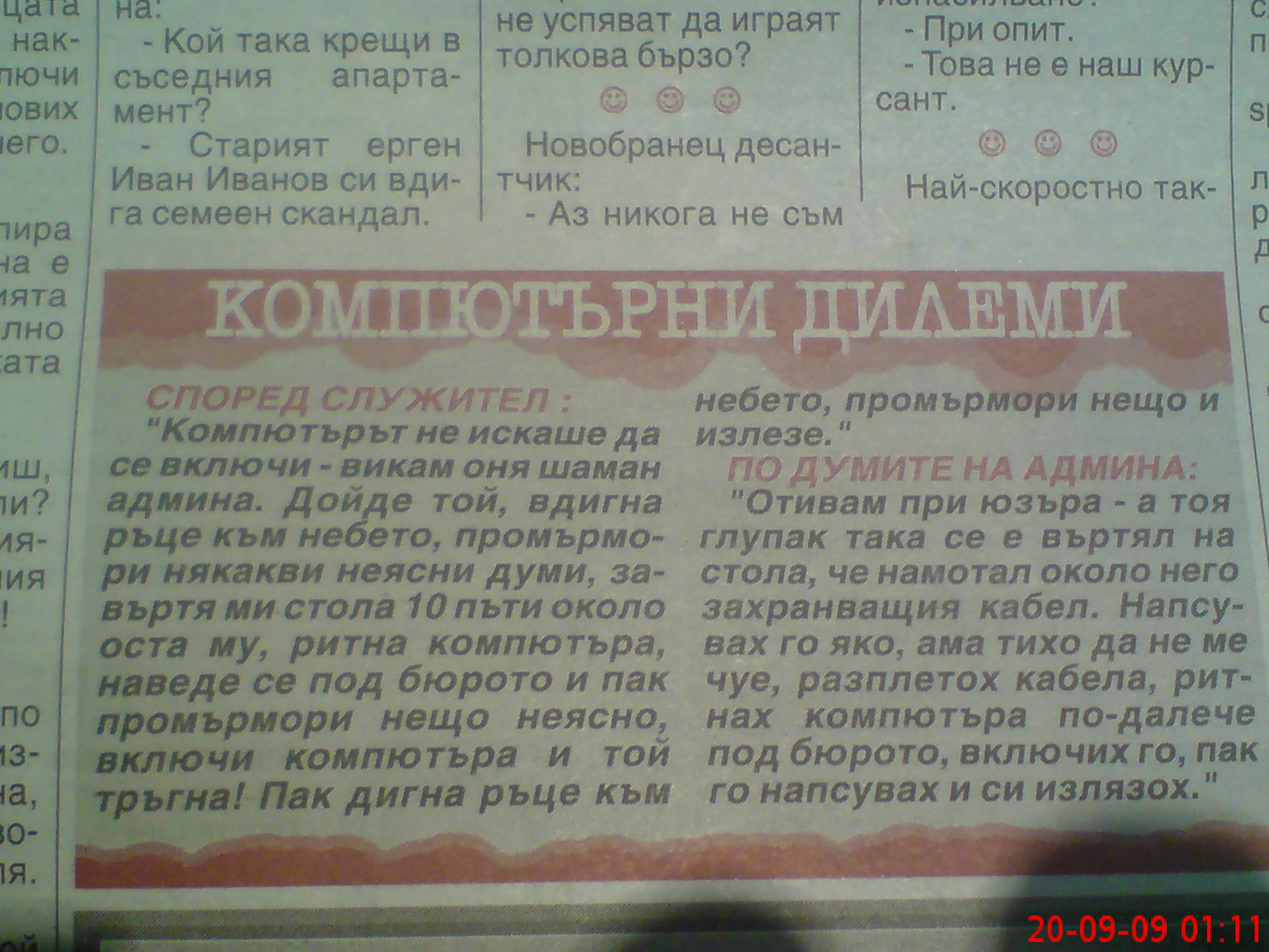 Системен администратор се учи да стреля на стрелбище. Вдига пистолета, изстрелва цял пълнител - нито един куршум в мишената. Инструкторът: